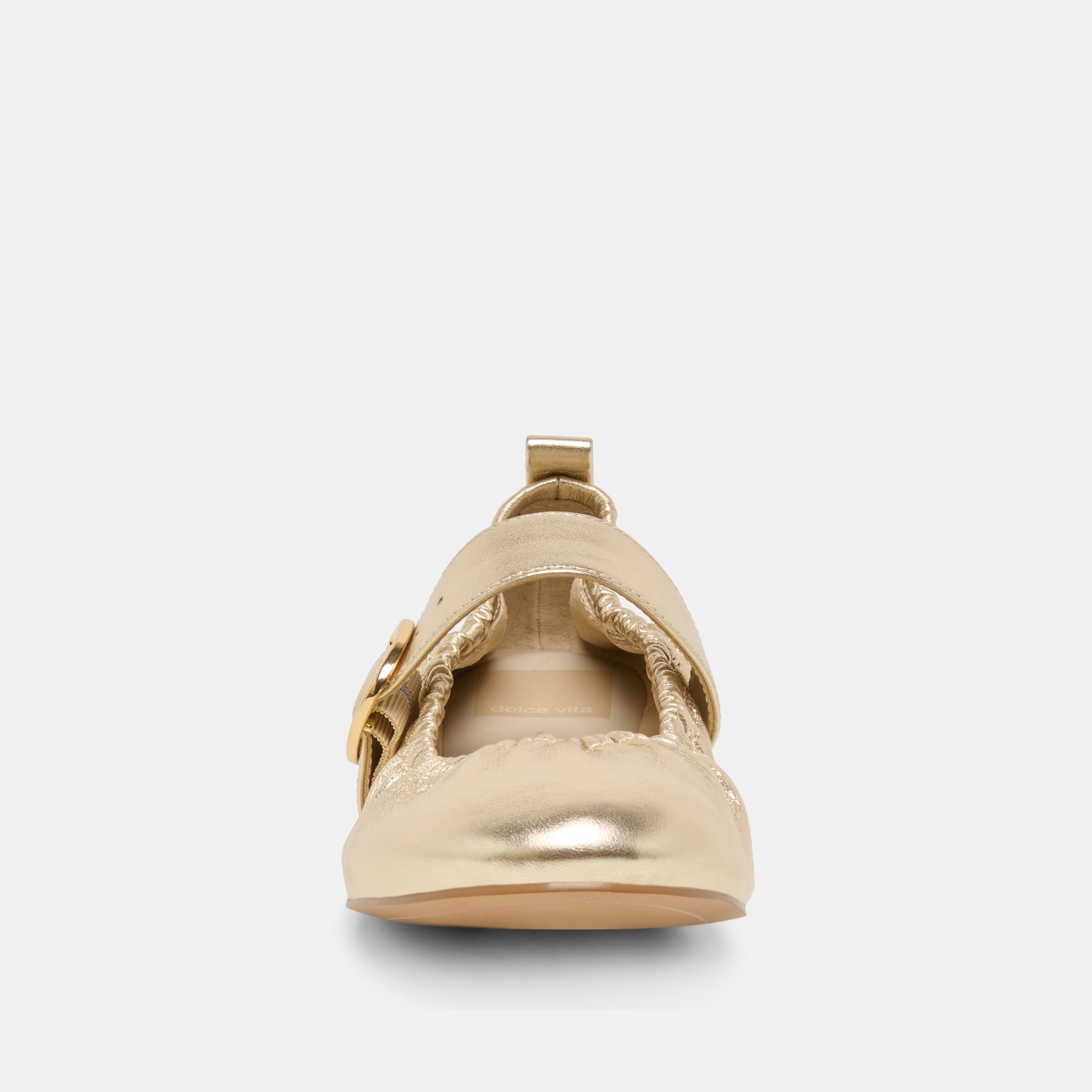 CAELY reimagines the classic ballet flat with soft ruching and a cinched silhouette for a flexible fit. Finished with a mary jane strap and gold buckle, this versatile, sustainably-crafted style is available in classic leather or printed and warm neutral suedes.