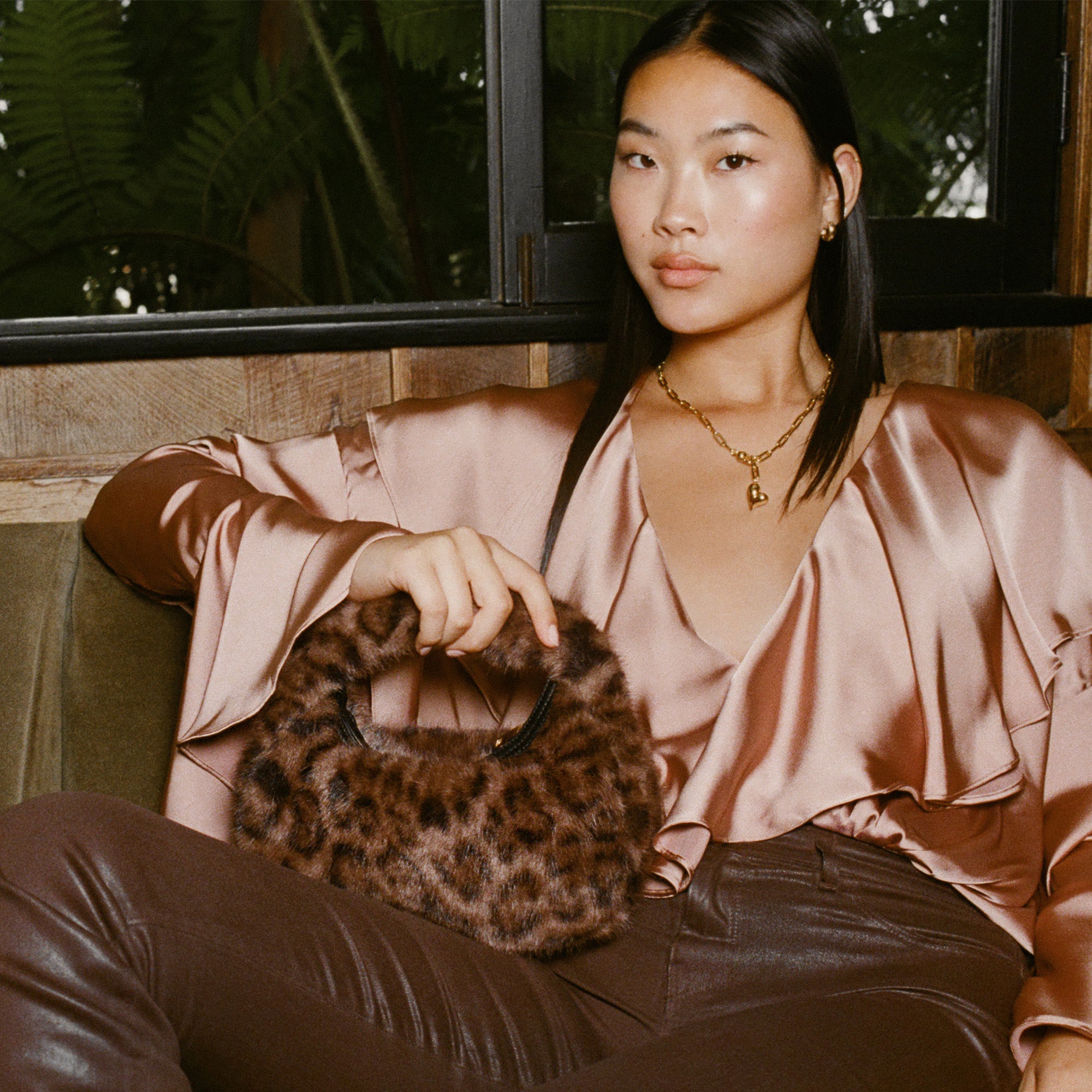 From the early aughts to your modern day statement bag. FRAKIE's fuzzy texture and current crescent moon-shaped silhouette features all-over leopard print or creamy natural texture for a neutral-yet-bold look. Pair this statement piece with all black ensembles and micro minis.