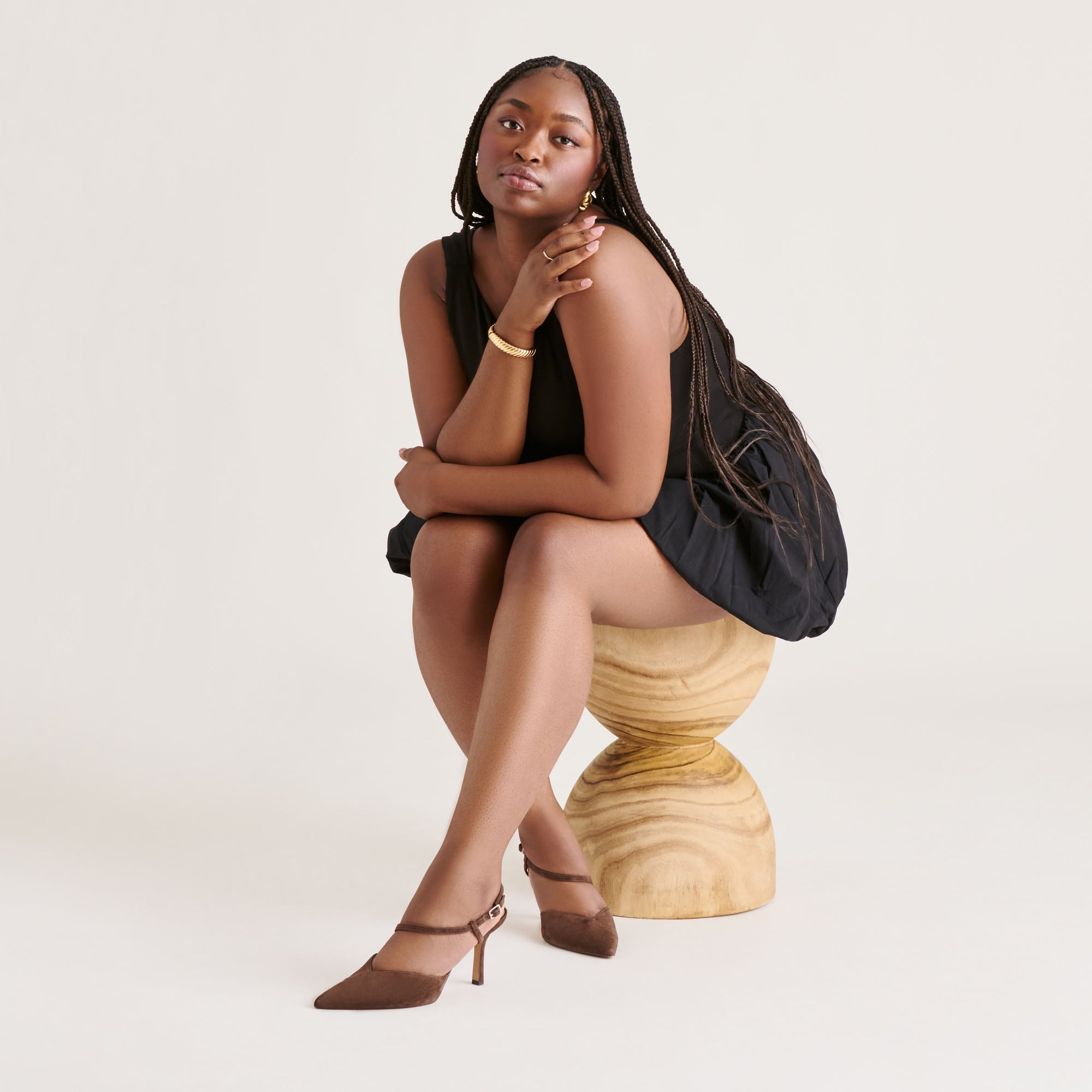 Modern and sophisticated KAMRA is your event heel of the season. Her pointed toe and stiletto heel are topped off with an alluring s-shaped strap. She’s crafted with recycled materials and available in colorways for every outfit.