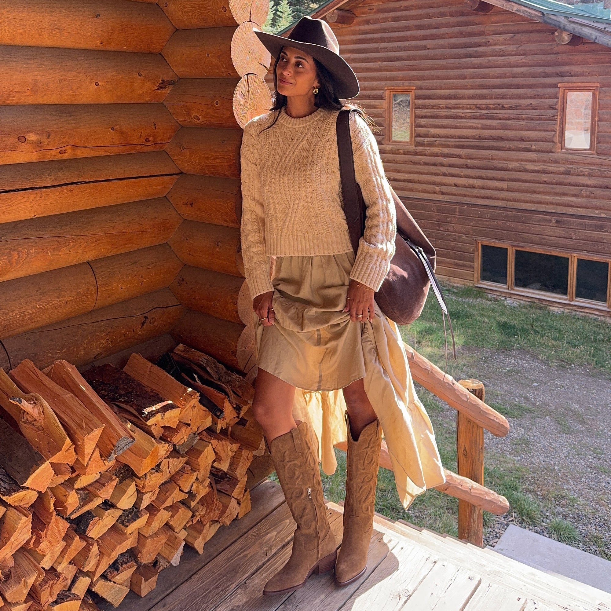 Add a little edge to your western look in MIRLA. This sustainably-crafted knee-high boot features tone on tone stitching details for bold dimension. Choose from oxblood, black, black multi, or lt brown to wear out with friends or to your next concert.